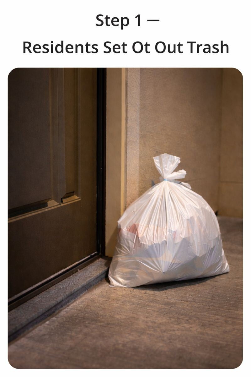 Residents place securely bagged trash outside their door during the scheduled service window.